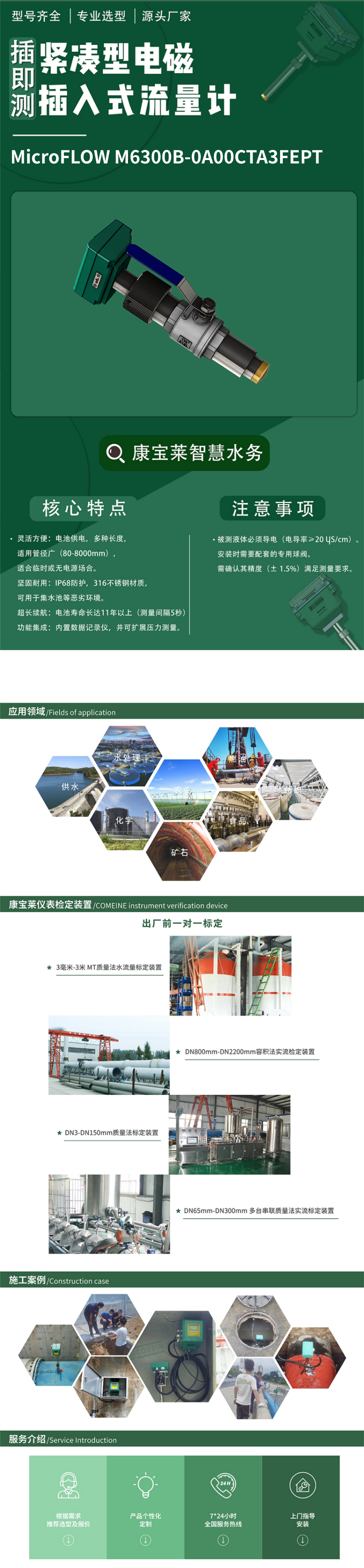 本产品是一款专为市政污水、工业废水等导电液体流量测量设计的高可靠性、微型化分体式插入电磁流量计。它采用电磁感应原理,结合带压开孔、不停水安装技术,MicroFLOW M6300B-0A00CTA3FEPT解决了大口径管道流量测量中安装困难、费用高昂的行业痛点,特别适用于现有管线的改造与计量。 其核心优势在于采用了高度集成的微型转换器(内部核心线路板尺寸:长48mm×宽43mm×厚23mm),使得整套系统结构更紧凑、响应更迅速、稳定性更高。同时,分体式设计允许转换器远传安装,便于在控制中心集中管理和查看数据,非常适合条件恶劣的安装地点。