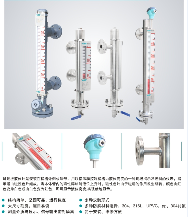 1、适用范围广、安装形式多样,适合任何介质的液位、界面的测量。2、被测介质与指示结构完全隔离,密封性能好,防泄露、适应高压、 高温、腐蚀条件下的液位测量,可靠性高。3、集现场指示、远传变送、报警控制开关于一体且可自由调整,功能齐全双色指示带夜光、连续直观、醒目、测量范围大,观察方向可任意改变。4、耐振动性能好,能适应液位波动大的情况下工作 结构简单,安装方便,维护费用低。5、带精美的磁钢校正器,现场随意校调技术参数。