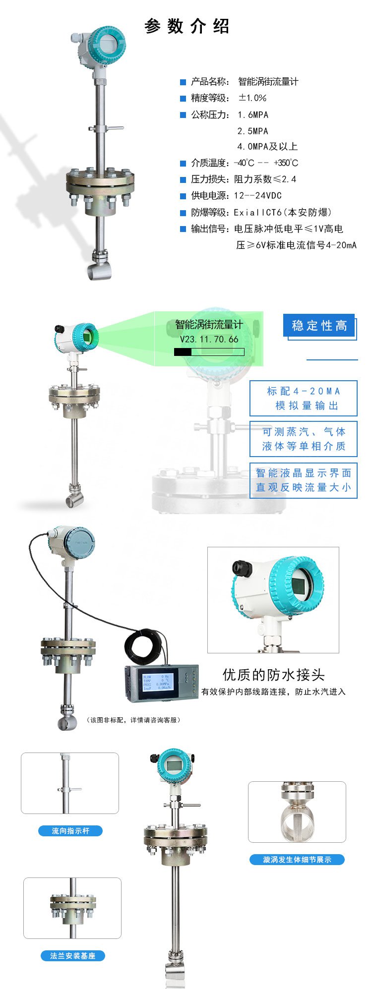 采用埋入压电晶体的涡街测速探头,插入大口径工业管道内,将卡门旋涡频率转换为与流量成正比的电流或电压脉冲信号或4~20mA电流信号。