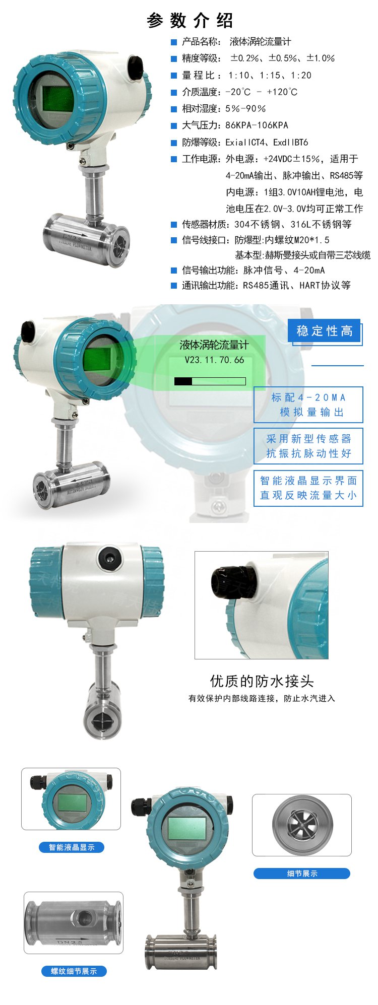 液体涡轮流量计结构为防爆设计,可以显示流量总量,瞬时流量和流量满度百分比。液体涡轮流量计(涡轮流量传感器与显示仪表配套组成涡轮流量计)。传感器液体涡轮流量计具有精度高,重复性好,寿命长操作简单等特点。可广泛应用于石油,化工,冶金,造纸等行业测量液体的体积瞬时流量和体积总量